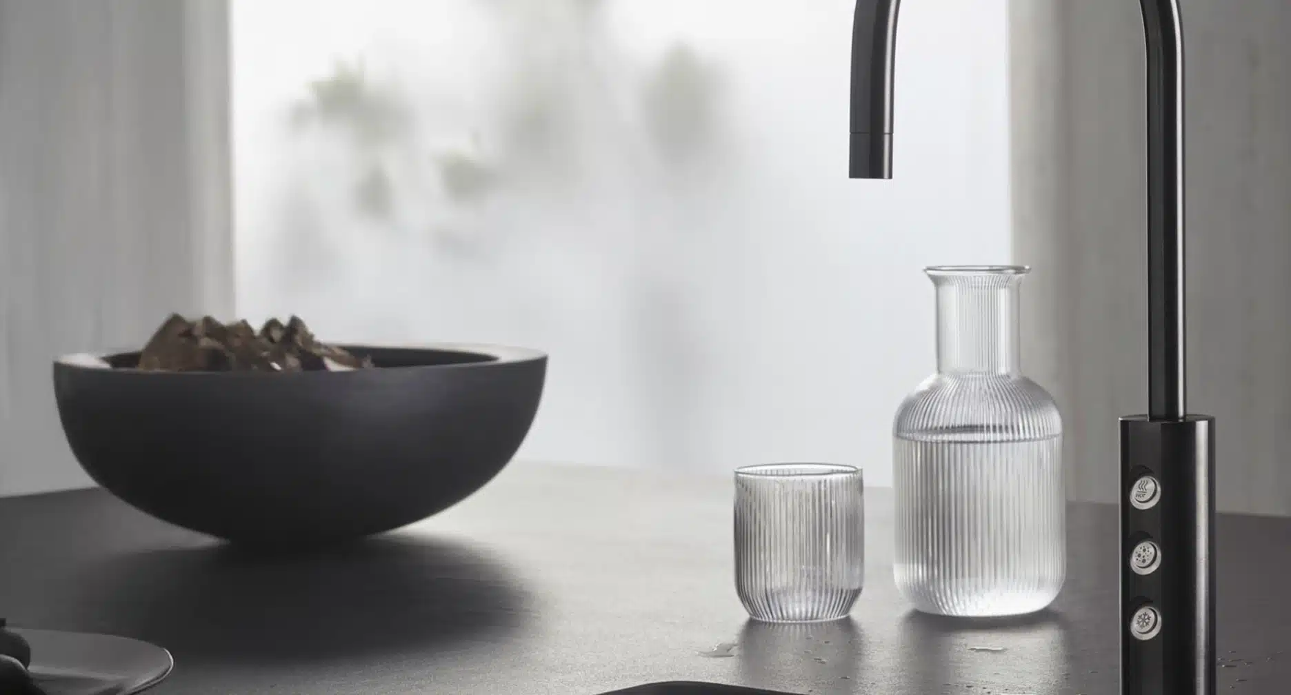 Eine normale Küchenarmatur mit Zugauslauf kombiniert mit einem intuitiven Controller für Funktionswasser: VARA ist mit integriertem oder externem Controller und in zwei eleganten Oberflächen erhältlich.